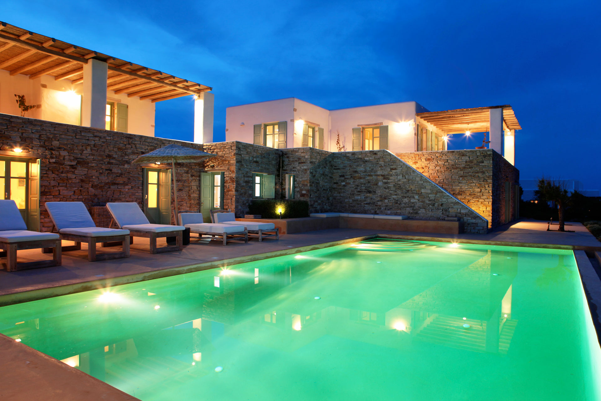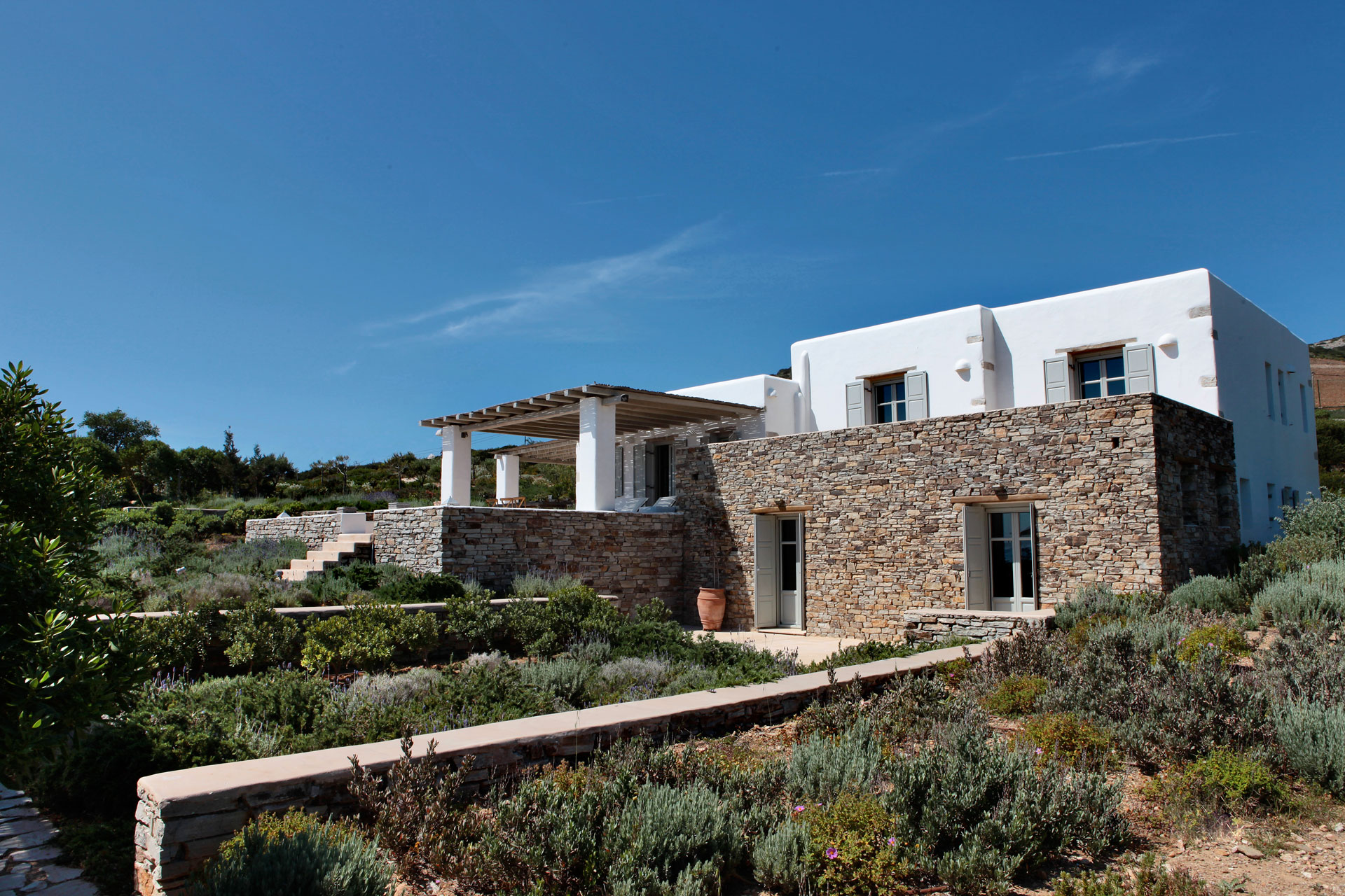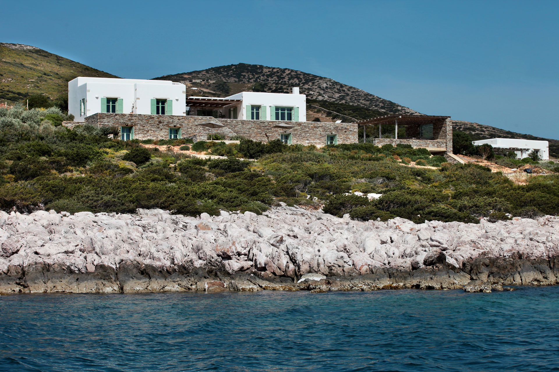 The five independent villas are situated within a large plot of land exactly by the coastline and they are all designed with great respect towards the natural landscape and traditional architecture. Each villa is a combination of minimalistic white-washed structures and impressive dry-stone walls, surrounded by a lush garden full of plants, flowers and aromatic herbs that flourish in the Mediterranean climate. At the same time, each dwelling possesses a private pool that blends harmoniously into the horizon, along with a terrace with extraordinary panoramic views of the Aegean Sea and the nearby islands. Finally, all five villas are fully equipped according to top-notch specifications, satisfying this way the need for privacy of unrivalled comfort and aesthetics.